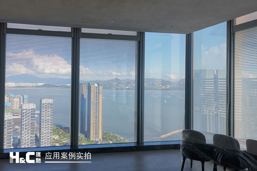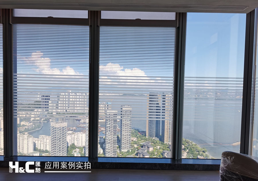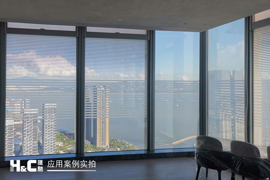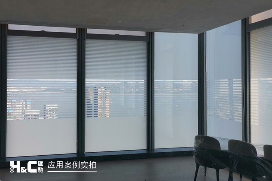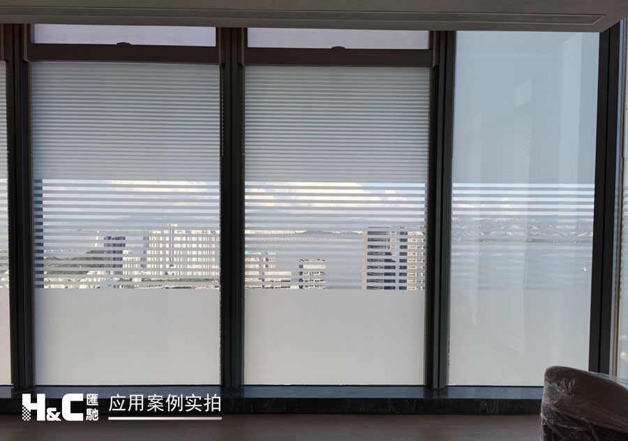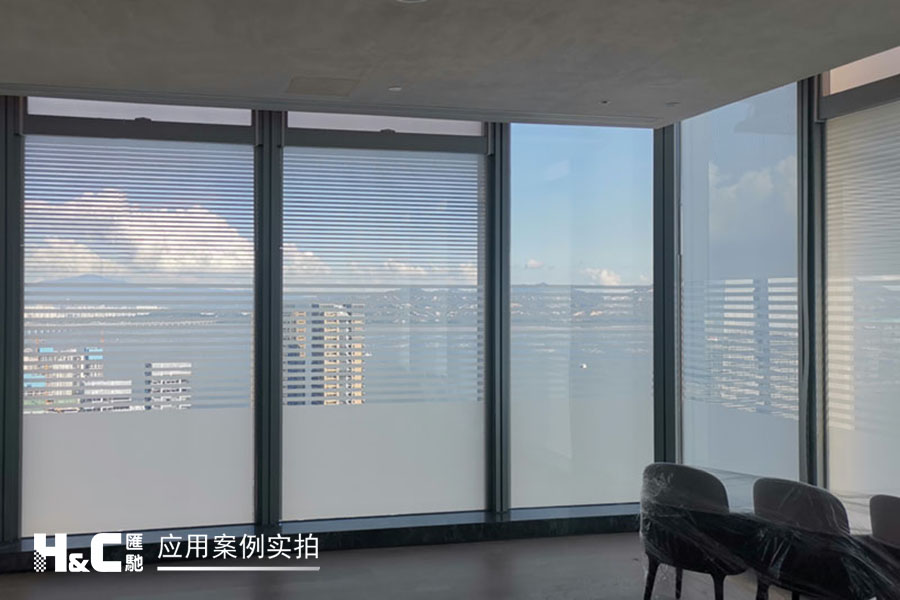 外立面的玻璃采光極好,但有時室外復(fù)雜的光線也會對室內(nèi)造成困擾。本案業(yè)主采用了廣州匯馳實業(yè)提供的百葉調(diào)光膜,貼在玻璃內(nèi)表面,讓普通玻璃變成調(diào)光玻璃。百葉的變化效果可以用遙控調(diào)控,有效控制光線的進入,讓玻璃變得更有科技感。