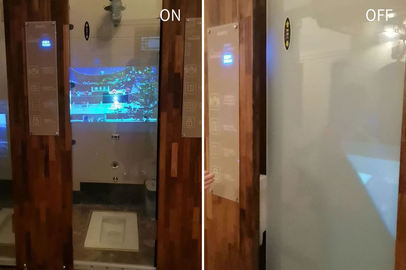 首先,讓人感觸最深的就是廁所的玻璃門,許多不了解的游客都看傻了眼,紛紛感嘆:要不要這么開放?透明的門怎么方便???其實,這是連接了感應控制系統的調光玻璃門。沒有人在里面的時候,玻璃門呈透明狀態,讓人一眼就能看到有空位;當有人進入廁所關上門后,玻璃門就會由透明瞬間轉換為不透明的霧化狀態,里面和外面都互相看不見,但玻璃的透光性良好,在里面的人不會感覺黑暗。