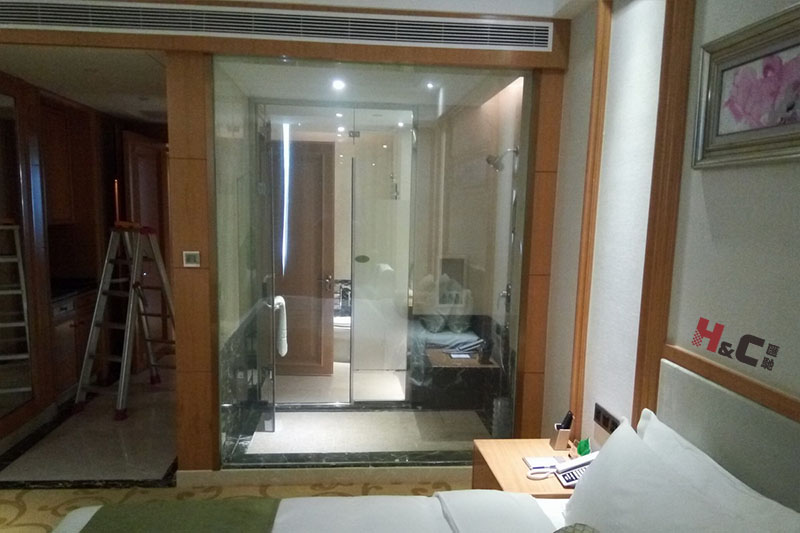 一些高星級的酒店里都會有浴缸這種豪華配置,配合調光玻璃隔斷,美觀實用,更能增加情趣。浴缸的長度一般在1.7米以內,如果要用調光玻璃作為浴室隔斷,一片寬幅1800mm的調光玻璃就可以完全遮擋住浴缸。